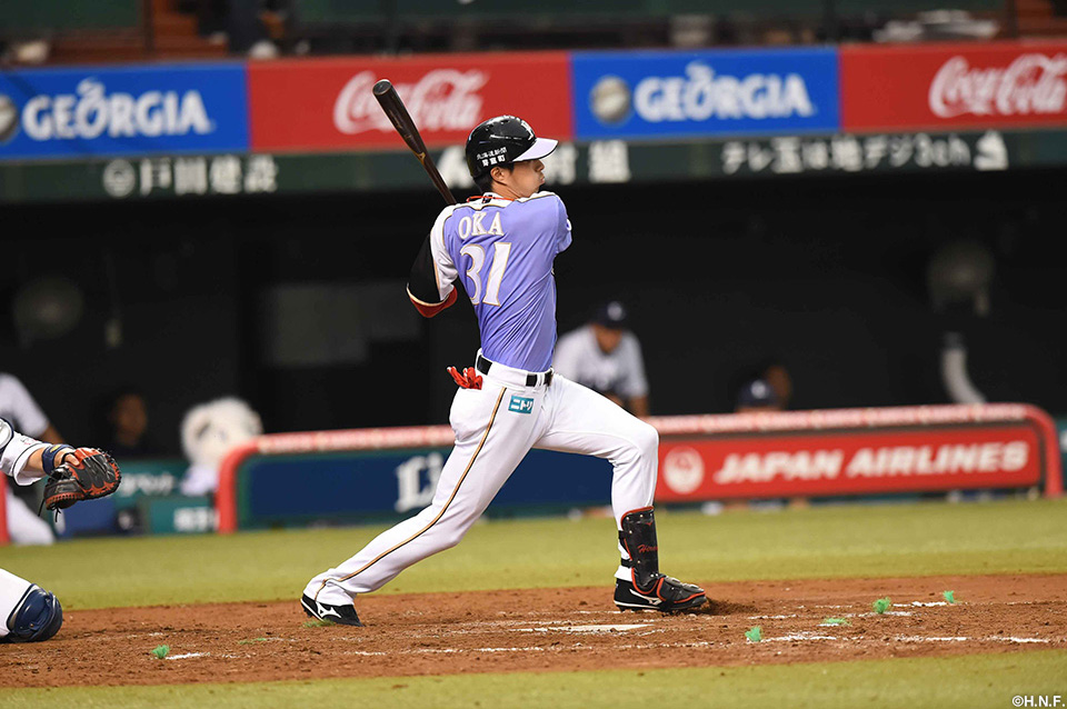 7番 岡 中安 ランナー2塁の0-1からセンターへのタイムリーヒット 西8-3日 1塁 ![]() 6