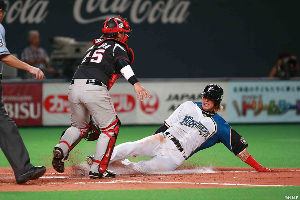 4番 中田 左翼二 カウント2-2からレフトへのタイムリーツーベースで日本ハム同点 日1-1ロ 2塁 ![]() 1