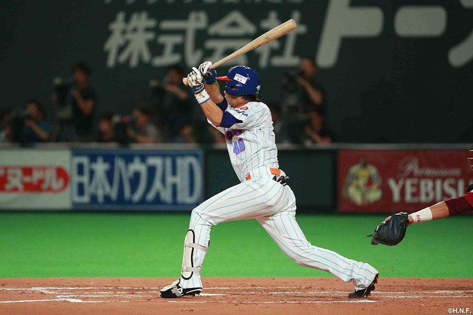 8番 矢野 左安 2アウト3塁からレフトへのタイムリーヒットで日本ハム同点! 日3-3楽 1塁 ![]() 3