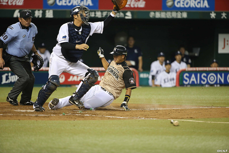 3番 田中賢 四球 内角のチェンジアップを見送りフォアボール。ファイターズ、満塁のチャンス 満塁 |