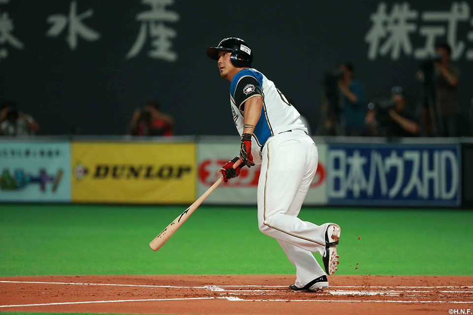 4番 中田 左越安 ランナーフルベースの2-2からレフトへのタイムリーヒットで日本ハム先制! 日2-0西 1,3塁 ![]() 2