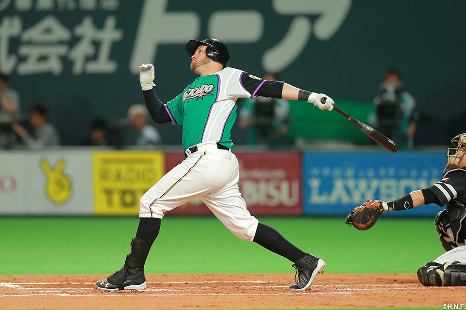 8番 レアード 左本 3-0からスタンド中段に飛び込むホームランを放つ 日2-0ソ ![]() 2