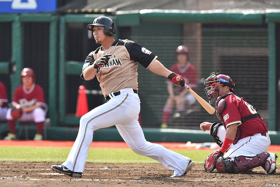 先制タイムリーを放つ中田選手