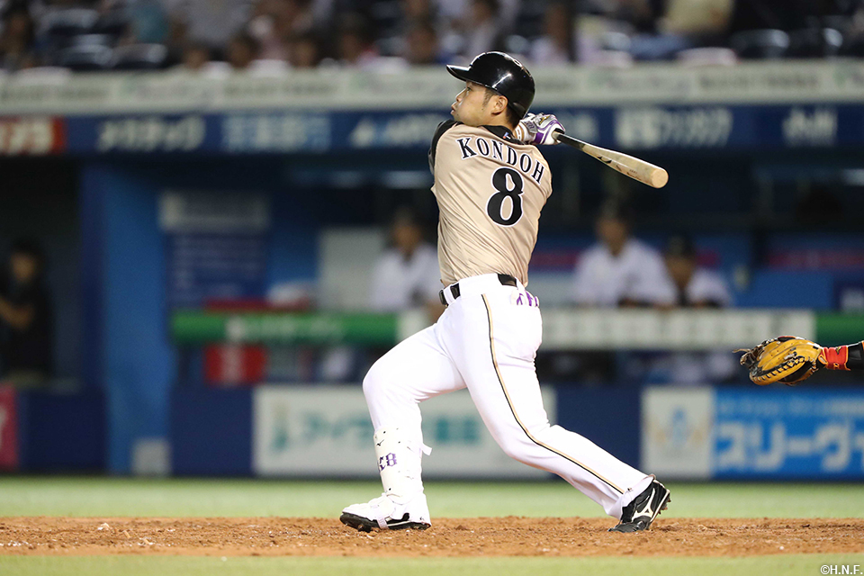 勝ち越しの犠牲フライを放つ近藤選手
