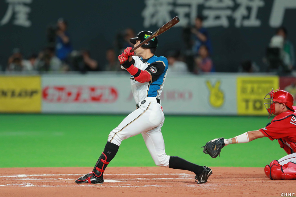 投手 ジョンソン 4番 中田 左安 内角のカットボールをレフトへ打ってヒット 1塁 |