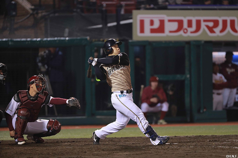 7番 石井一 左本 カウント3-1からレフトスタンドへ先制ホームラン! 楽0-1日 ![]() 0