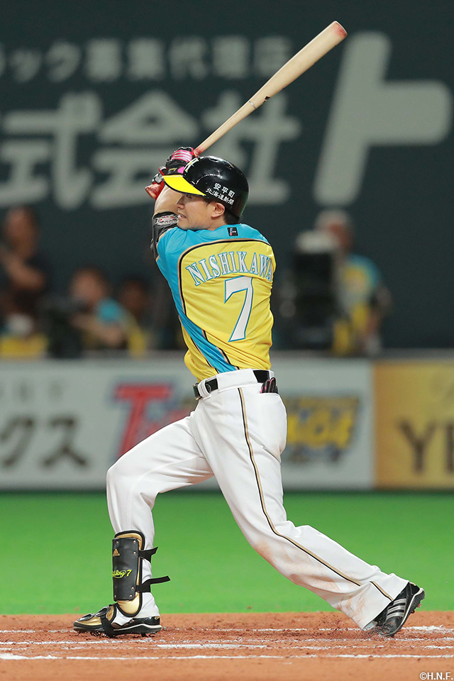 1番 西川 左犠飛 ランナー3塁 カウント2-2からレフトへ犠牲フライ 日1-0楽 2アウト ![]() 1