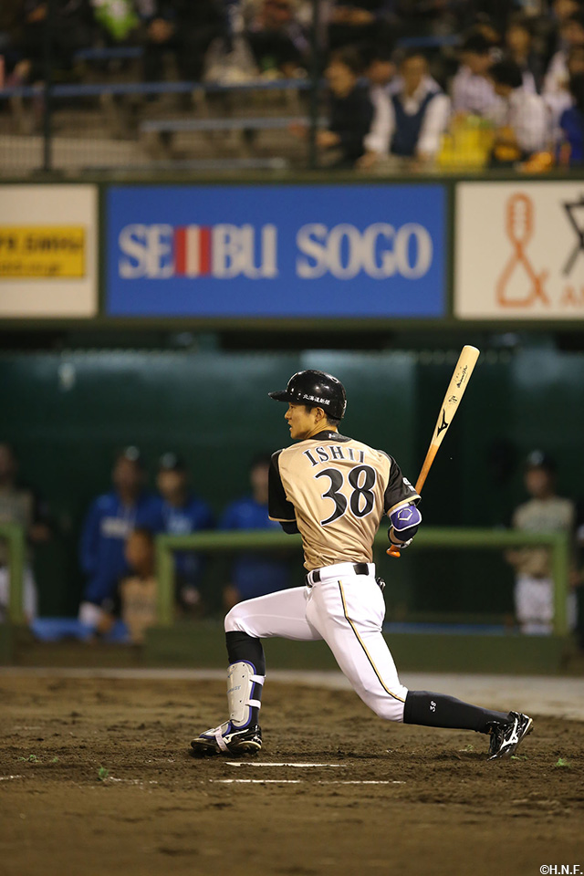 8番 石井一 中安 ランナー1,2塁 内角のスライダーをセンターへタイムリーヒット! 1,2塁 西1-4日 ![]() 1