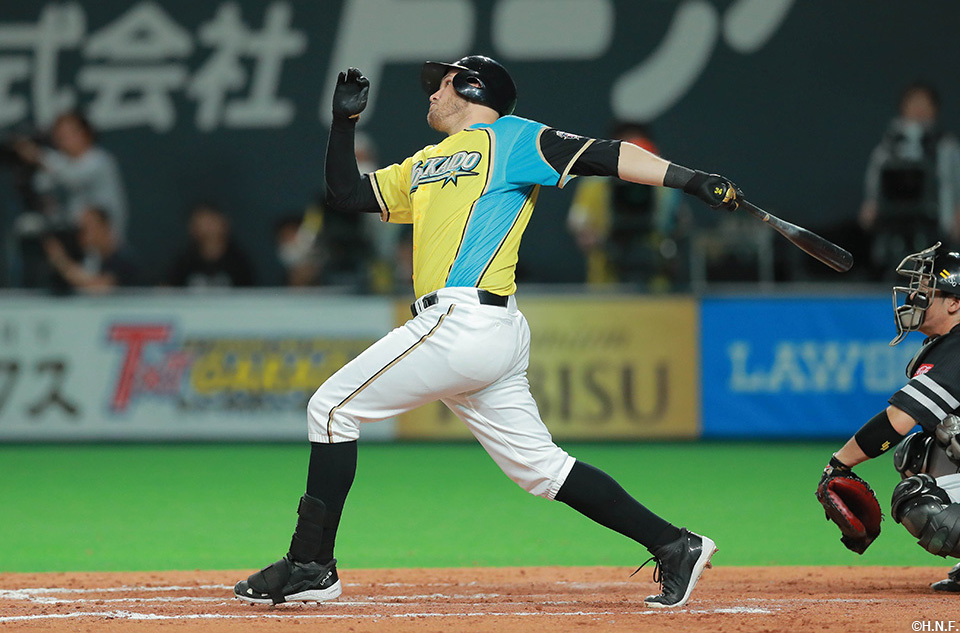 5番 レアード 四球 フォアボールを選ぶ 1,2塁 |