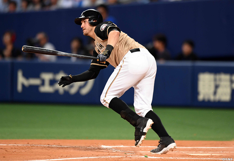 5番 レアード 左安 ランナー2塁 外角低めのフォークをレフトへ同点タイムリーヒット! 2塁 中4-4日 ![]() 4