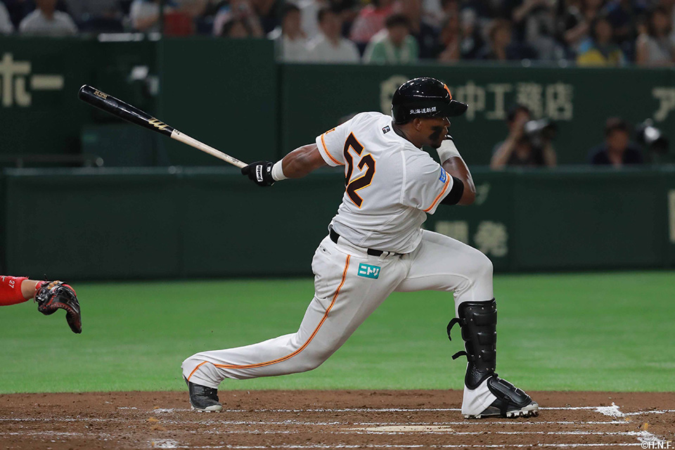 4番 レアード 左安 ど真ん中のスライダーをレフトへ打ってヒット 1塁 |