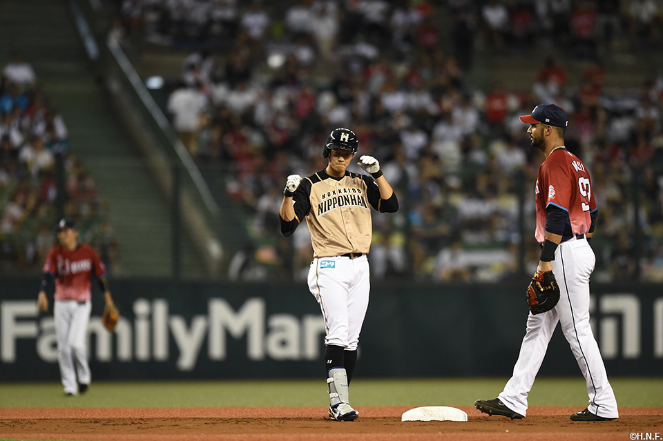 3番 中田 右2 155キロの外角高めのストレートをライトへ打ってツーベース 2塁 |