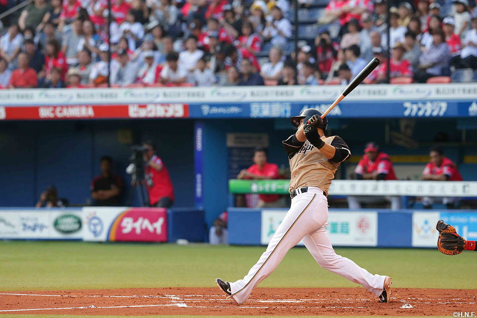 9番 石井一 右本 ランナー1,3塁 カウント1-0からライトスタンドへ勝ち越し3ランホームラン! ロ2-5日 ![]() 2