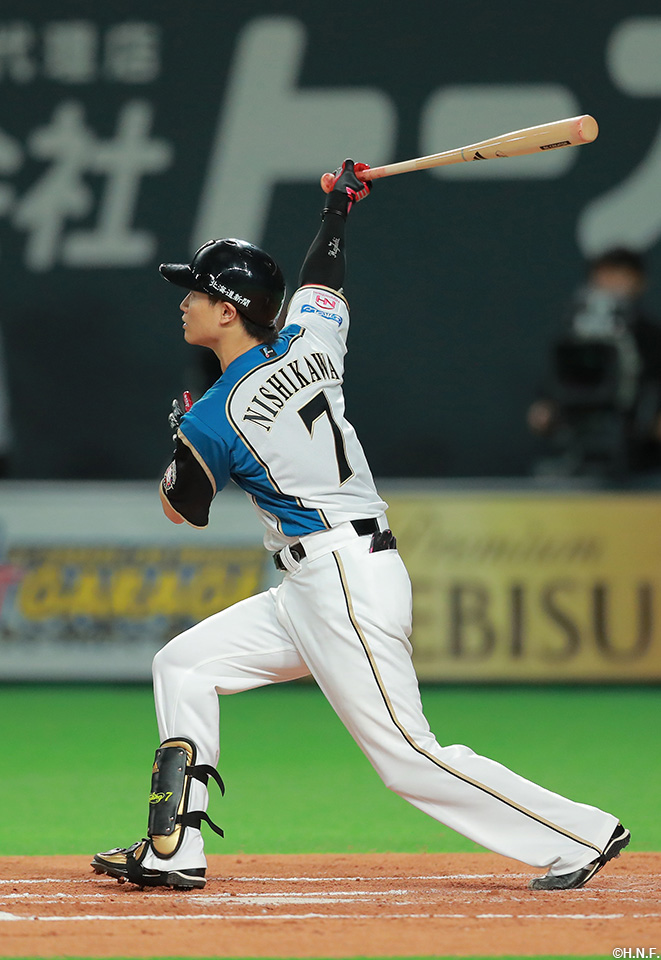 1番 西川 右本 ランナー1塁 フルカウントからライトスタンドへ2ランホームラン! 日7-1オ ![]() 7