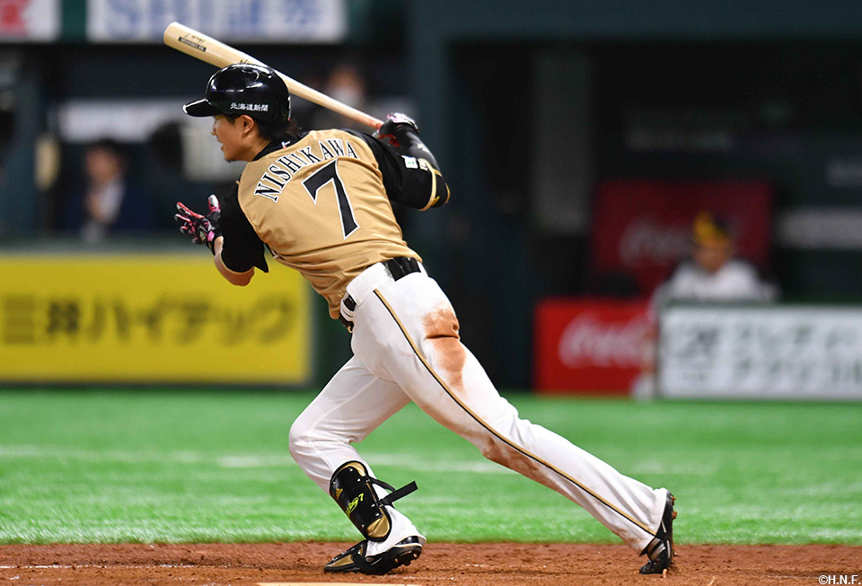 1番 西川 右安 満塁 外角低めのシンカーをライトへ先制タイムリーヒット! 満塁 ソ0-1日 ![]() 0