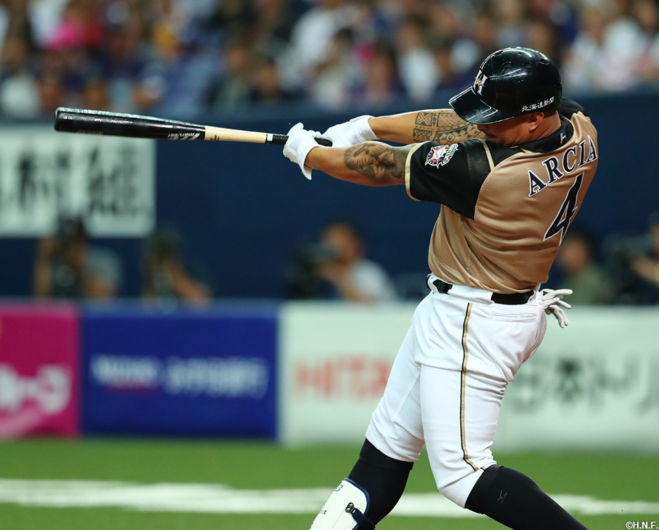 5番 アルシア 右本 ランナー1,2塁 カウント1-1からライトスタンドへ先制3ランホームラン! オ0-3日 ![]() 0