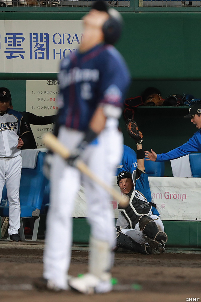 1番 金子侑 捕邪飛 ファウルフライを鶴岡(捕)が捕球してバッターアウト 3アウトチェンジ  |