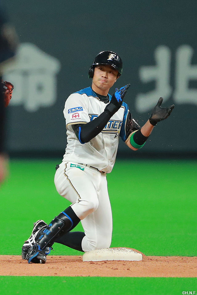 投手 上沢 8番 若月 右2 内角のフォークをライトへ打ってツーベース 2塁 |