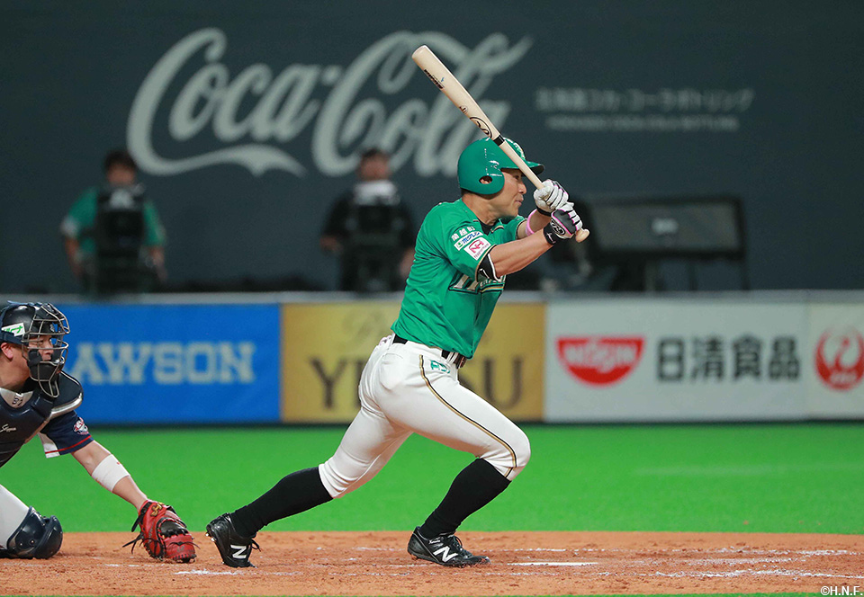 9番 外崎 三安 外角低めのカットボールをサードへ打ってヒット 1塁 |