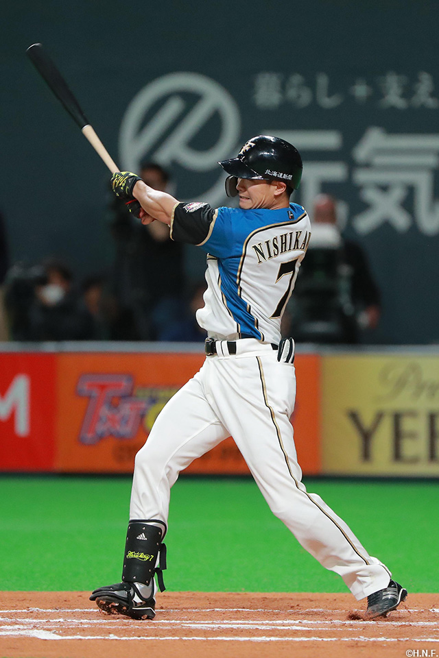 1番 西川 四球 フォアボールを選ぶ 1塁 |