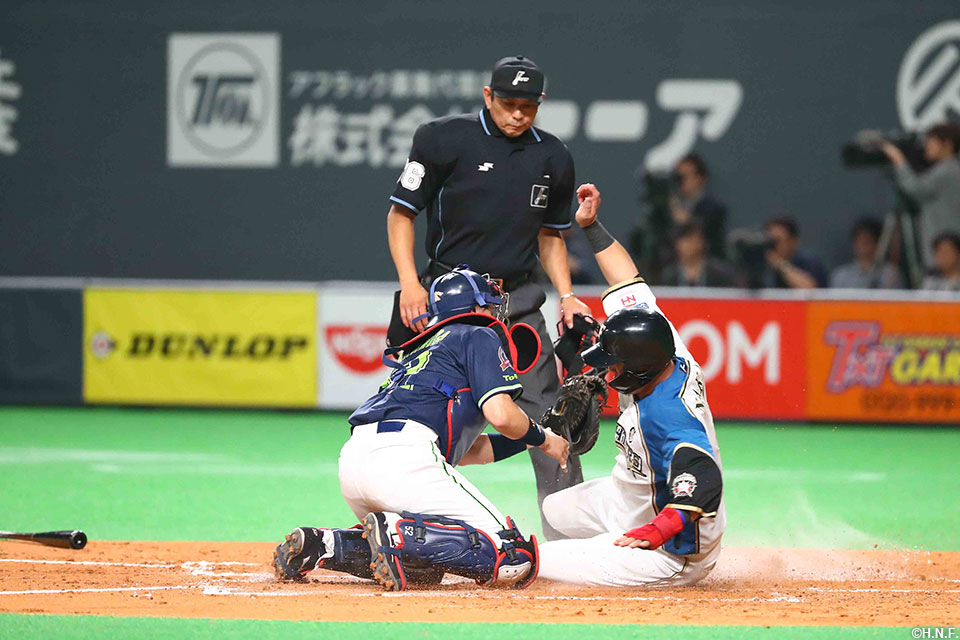 6番 清宮 左邪飛 ファウルフライを青木(左)が捕球してバッターアウト 3アウトチェンジ |