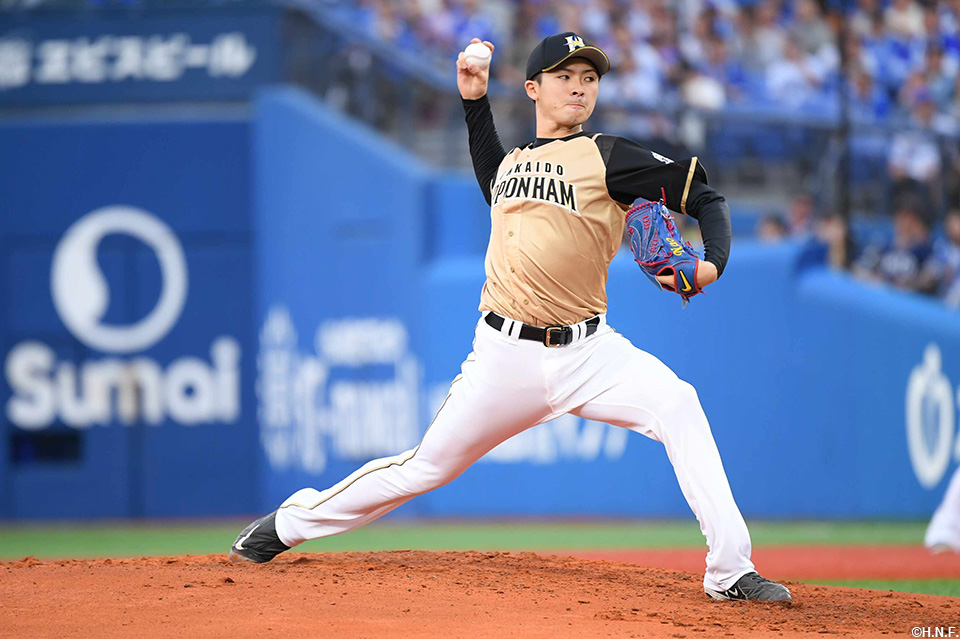 投手 上沢 8番 大和 空三振 外角低めのカーブを空振り三振 1アウト  |
