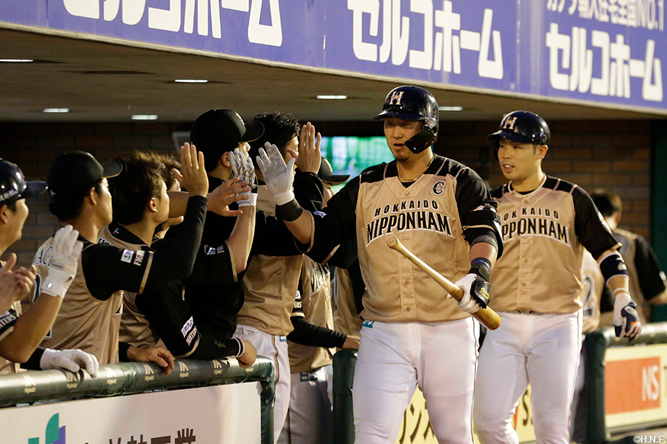 4番 中田 左本 ランナー1塁 カウント1-1からレフトスタンドへ先制2ランホームラン! 楽0-2日 ![]() 0
