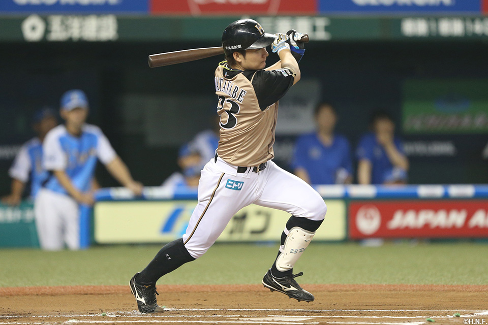 5番 渡邉 中安 ランナー2塁 外角のチェンジアップをセンターへタイムリーヒット! 1塁 西5-3日 ![]() 5