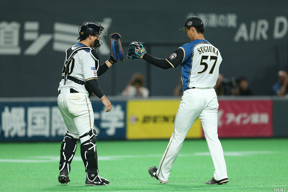 ピンチを抑えた杉浦投手と宇佐見選手