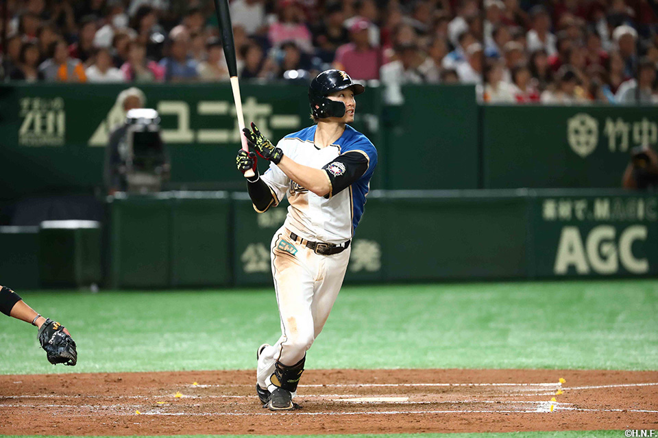 4番 中田 左犠飛 ランナー2,3塁 カウント2-2からレフトへ犠牲フライ 2塁 日4-1楽 1アウト ![]() 4