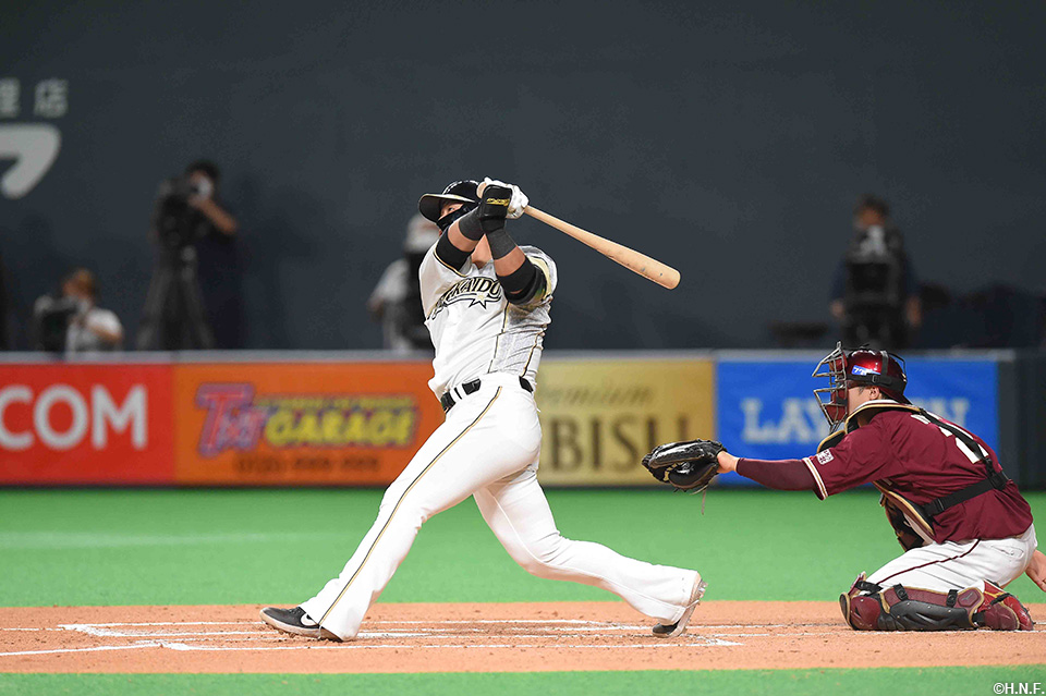レフトへ勝ち越し2ランを放つ中田選手