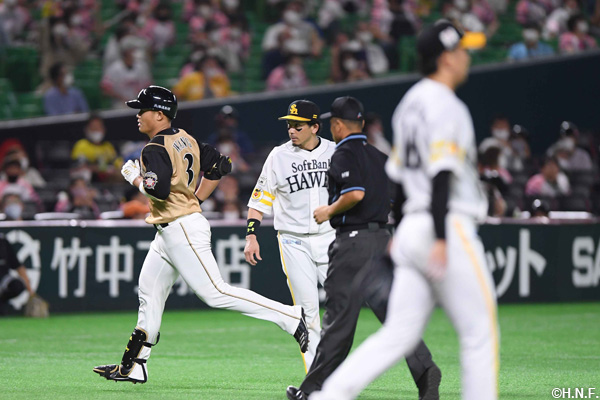 投手 東浜 3番 近藤 一失 中村晃(一)のファンブルにより出塁する 1塁 |