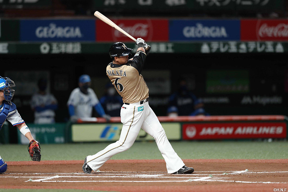 タイムリーヒットを放つ中田選手