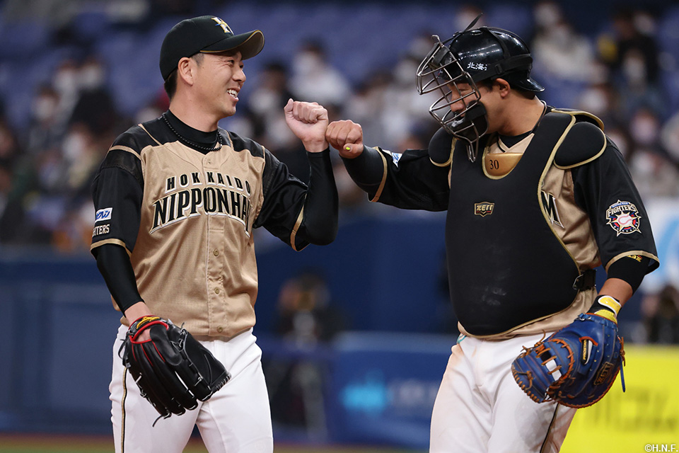 宮西投手と盗塁を阻止した宇佐見選手