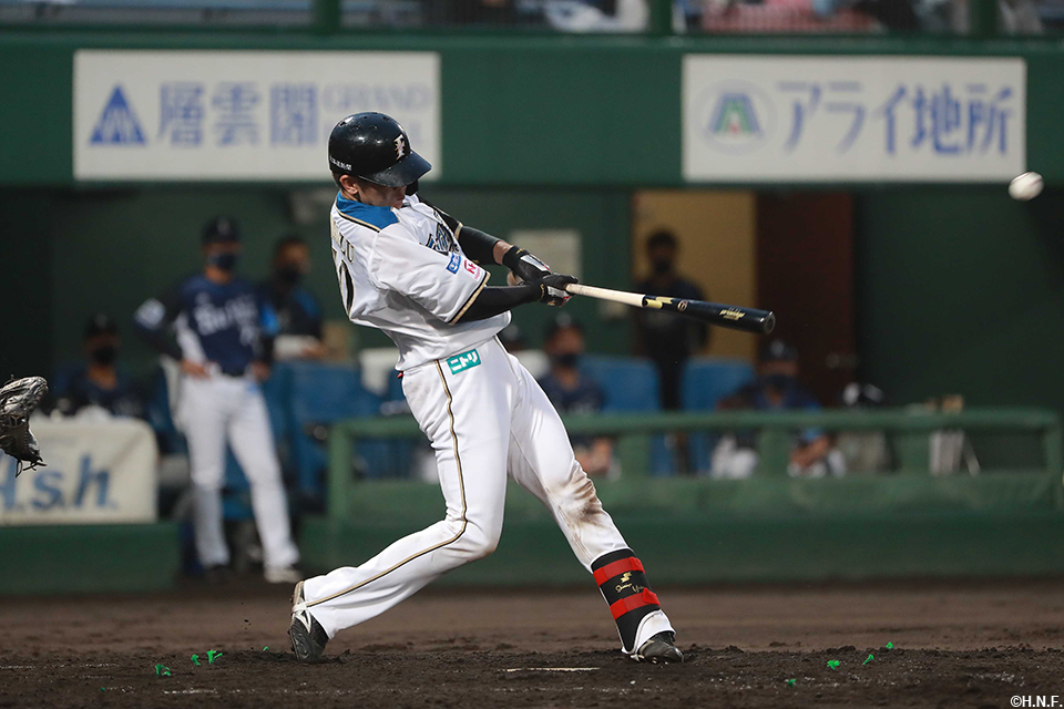7番 万波 中安 ランナー1塁 外角低めのストレートをセンターへ打ってヒット 1,2塁 |