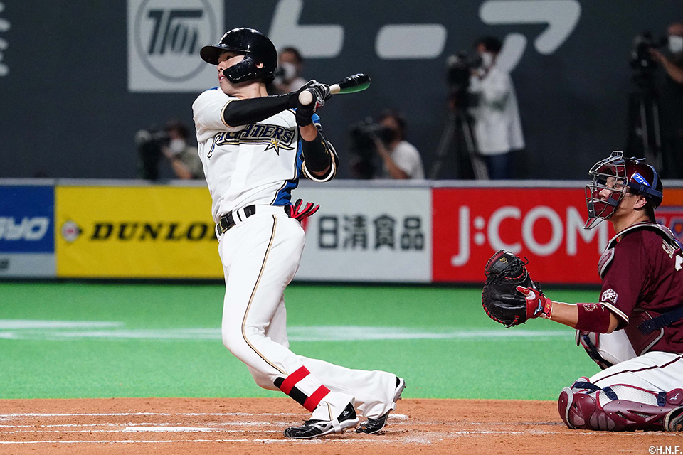 9番 清水 左安 ランナー1,3塁 内角高めのシンカーをレフトへタイムリーヒット! 1,2塁 日2-0楽 ![]() 2