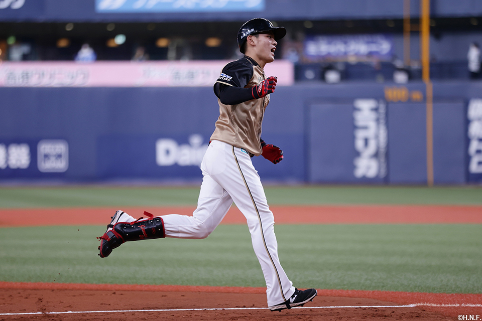 バックスクリーンへ勝ち越し本塁打を放った野村選手