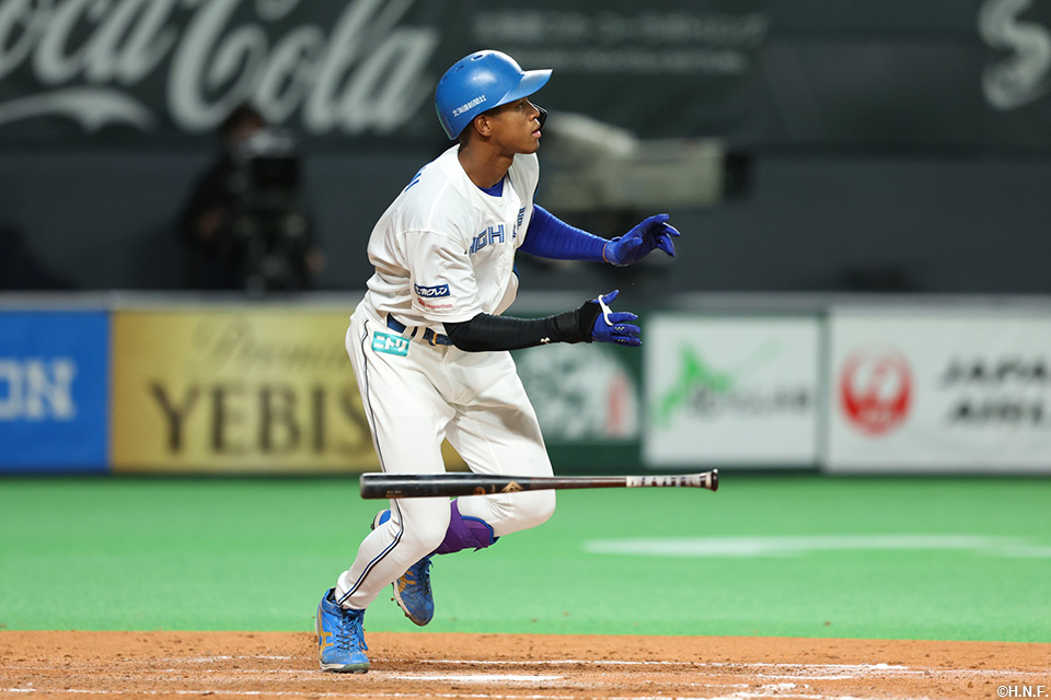 4番 松本剛 右安 ランナー2塁 外角のスライダーをライトへタイムリーヒット! 1塁 日2-5楽 ![]() 2