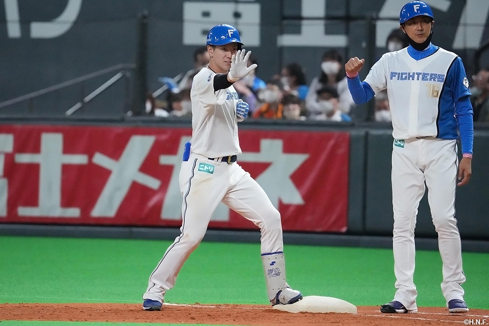 1番 松本剛 中安 満塁 外角のスライダーをセンターへタイムリーヒット! 満塁 日4-1巨 ![]() 4