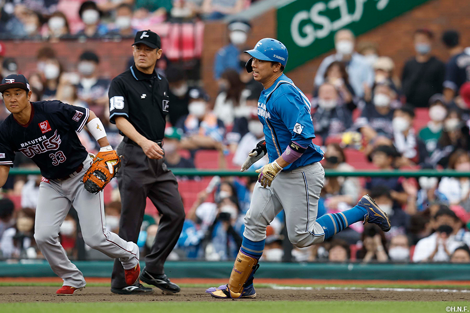 渡邊佳(右)の悪送球により進塁する 2塁 楽0-8日 |