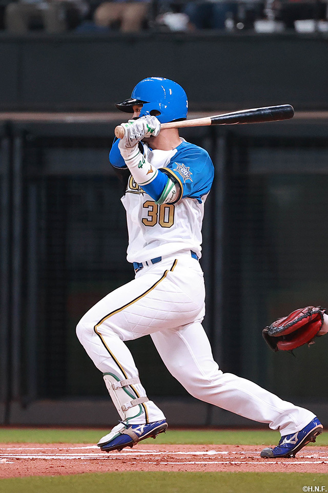 6番 松本剛 右安 外角低めのカットボールをライトへ打ってヒット 1塁 |