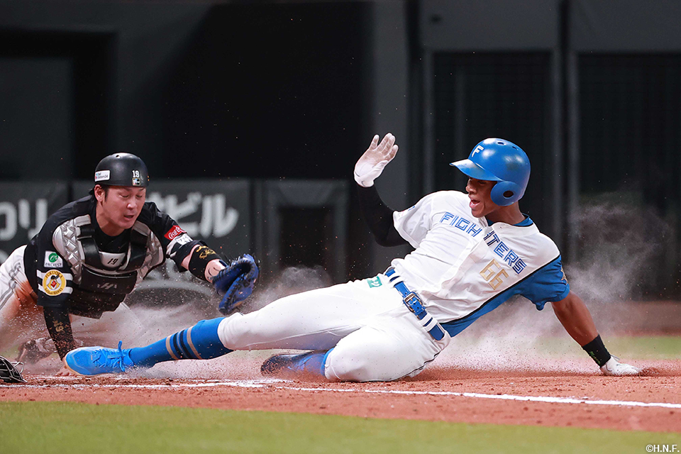 2番 松本剛 二失 三森(二)のファンブルにより進塁する 1,2塁 |