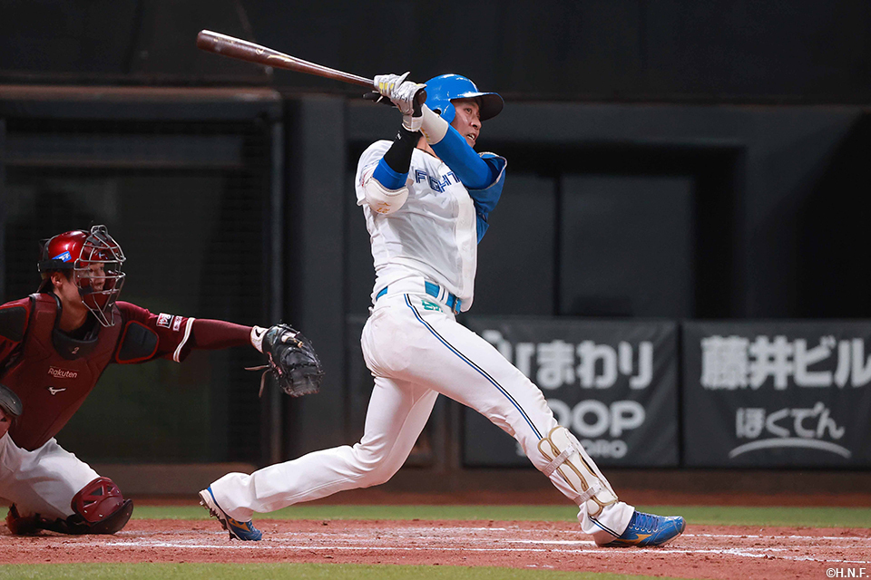 7番 松本剛 中飛 ランナー1,2塁 高めのストレートを打つもセンターフライ 2アウト |