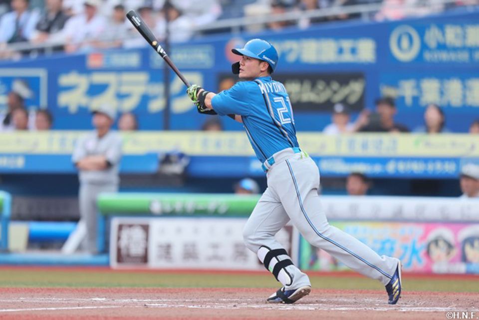 5番 万波 空三振 外角低めのカットボールを空振り三振 1アウト |