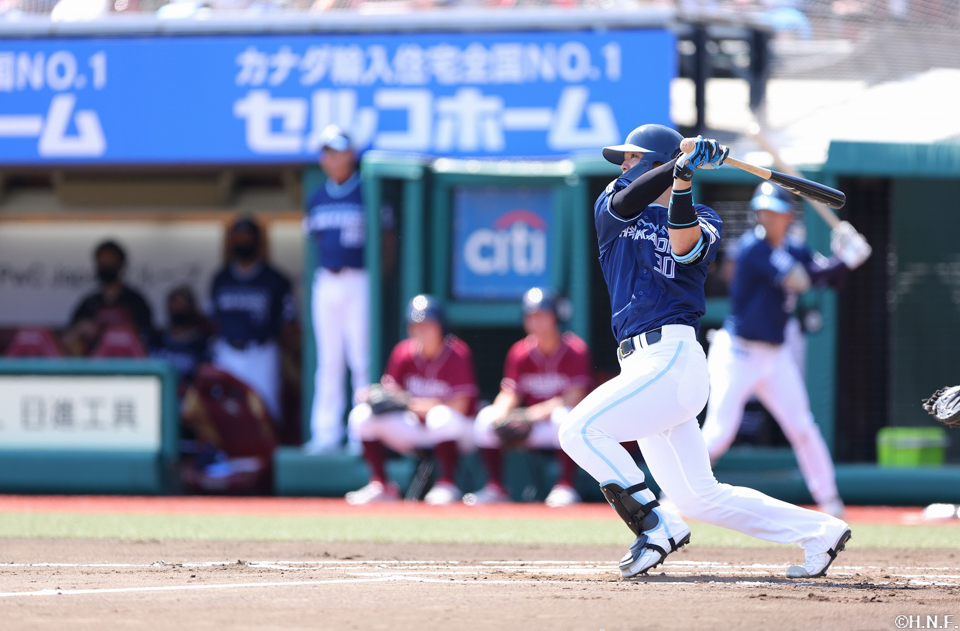 2番 五十幡 右安 満塁 外角低めのフォークをライトへタイムリーヒット! 満塁 楽1-4日 ![]() 1