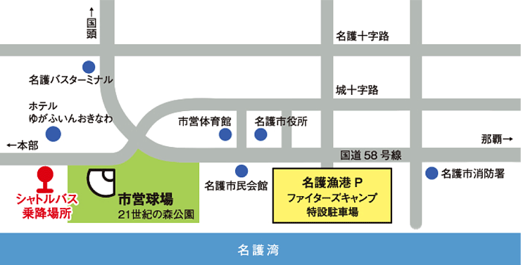 2月12日(日)より沖縄県名護市にて行われる春季キャンプ期間中の、名護市営球場へのアクセスについてお知らせいたします。春季キャンプ期間中(2月12日(日)2月26日(日))は、近隣の周辺駐車場は野球観戦(ファイターズ春季キャンプ見学)の方はご利用できませんので、特設駐車場およびシャトルバスをご利用ください。