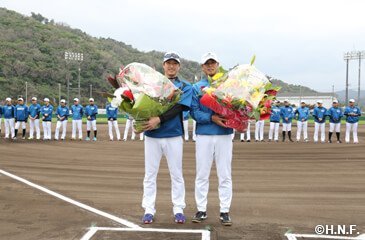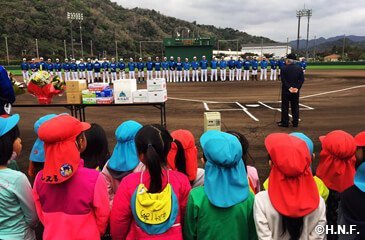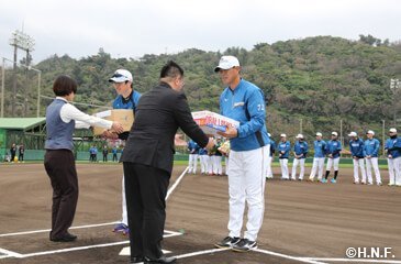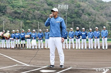 2月1日(火)、沖縄県国頭村のかいぎんスタジアム国頭でファーム春季キャンプがスタートしました。練習開始に先立ち、キャンプ開催セレモニーが球場内で開かれ、タンカン30キロやオクマの水などがチームに贈呈されました。挨拶した田中幸雄ファーム監督は「昨年、日本一に貢献した主力メンバーもここに来ているので、いい調整をして、いい状態で1軍に合流してほしい。ファームは若い選手が多いので、将来の1軍を目指していい成果を出せるようにスタッフも協力していきたいと思います」と話していました。