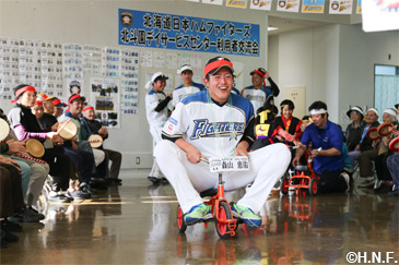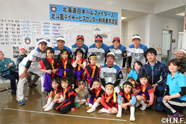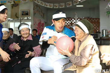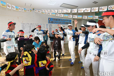 沖縄県国頭村で春季キャンプを行っている北海道日本ハムファイターズの田中幸雄ファーム監督と新入団7選手が2月7日(火)、村内にある特別養護老人ホーム「北斗園」のデイサービスセンターを訪れ、交流会に参加しました。施設訪問は2008年に始まり、今回が10回目。球場から駆けつけた選手たちは練習の疲れも見せず、およそ1時間、利用者の皆さんと交流を深めていました。
