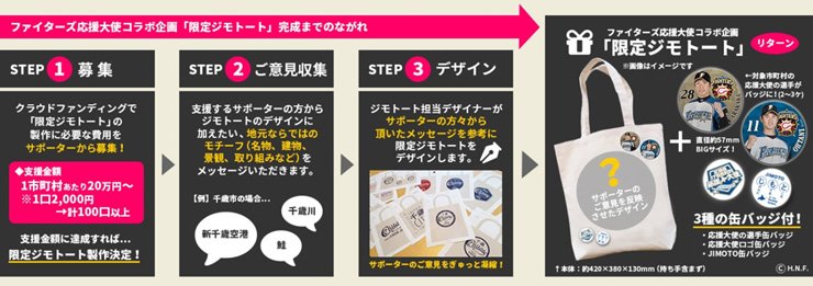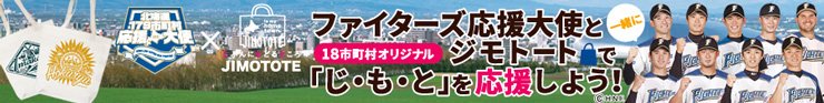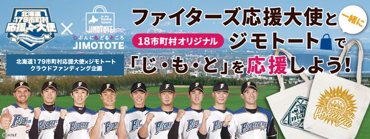 北海道日本ハムファイターズでは今年も、株式会社ジムニーワークス(所在地:札幌市中央区、代表取締役社長:珊瑚 和範)が展開するオリジナル企画商品『JIMOTOTE(ジモトート)』と〈北海道179市町村応援大使〉の活動を連動させた〈ファイターズ応援大使と一緒にジモトートで「じ・も・と」を応援しよう!〉をスタートいたします。
