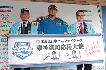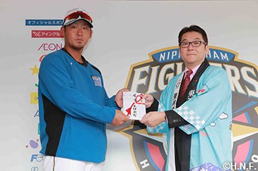 『花のまち』として全国的に知られる東神楽町は、町内にある約150箇所の公共花壇に見事な花が咲き誇ります。また同町を含む上川盆地一帯は北海道の米の主産地でもあり、沖縄名護キャンプへ激励にかけつけた山本町長から『東神楽産米ななつぼし、ゆめぴりか』などの特産品が贈呈されました。「東神楽町は北海道で一番、子どもの人口比率が高い町です。子ども達みんな中田選手、白村投手の活躍を期待しています」と山本町長から声を掛けられると、中田選手は「子ども達がたくさんいる町ということなので、これからはもっと子ども達の見本になれるようなプロ野球選手になっていきたいと思います」と引き締まった表情でこたえました。白村選手は、2軍キャンプ地・国頭村での紅白戦へ向け、すでに球場を後にしていたため中田選手が代表して激励を受けました。